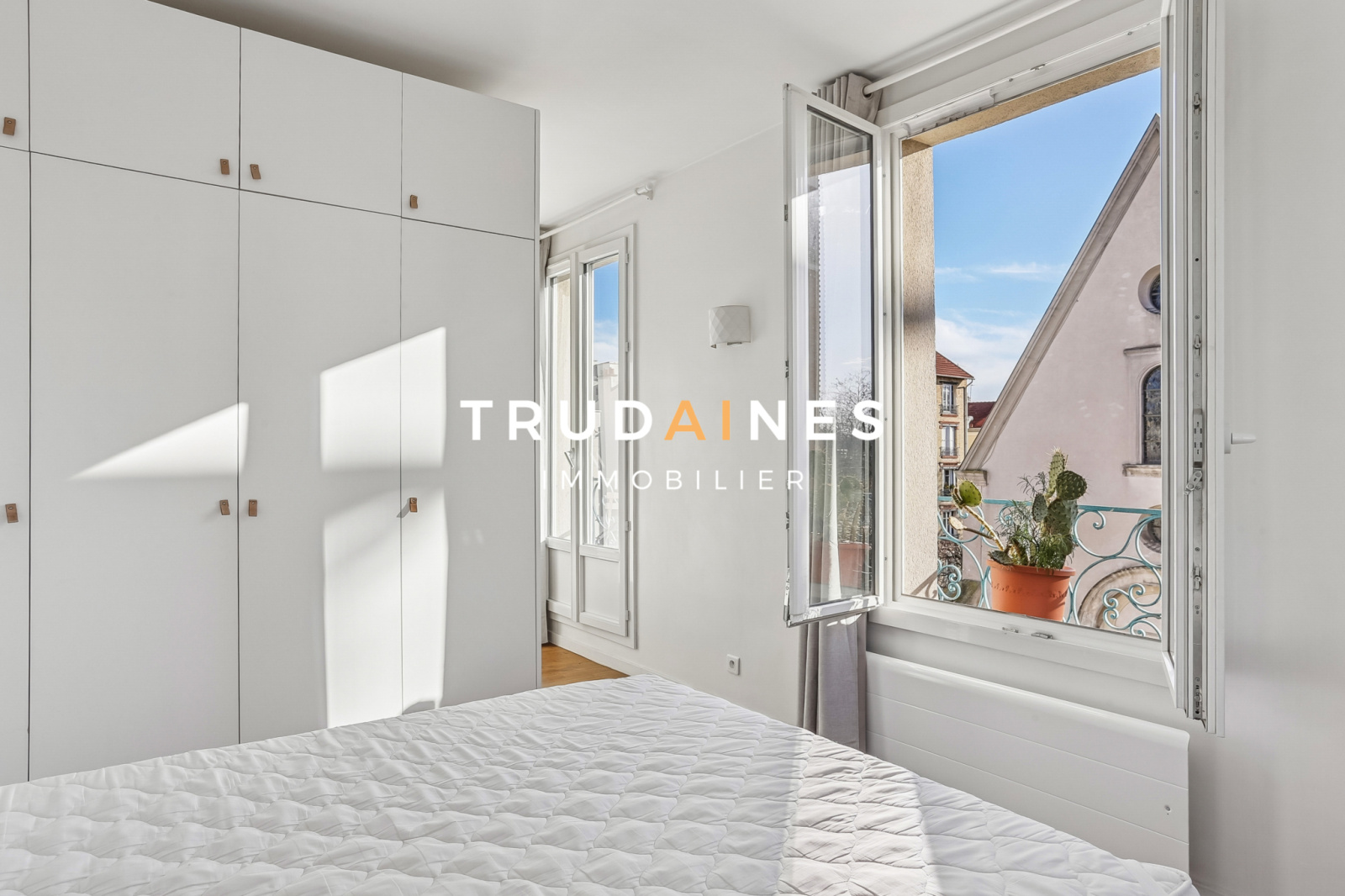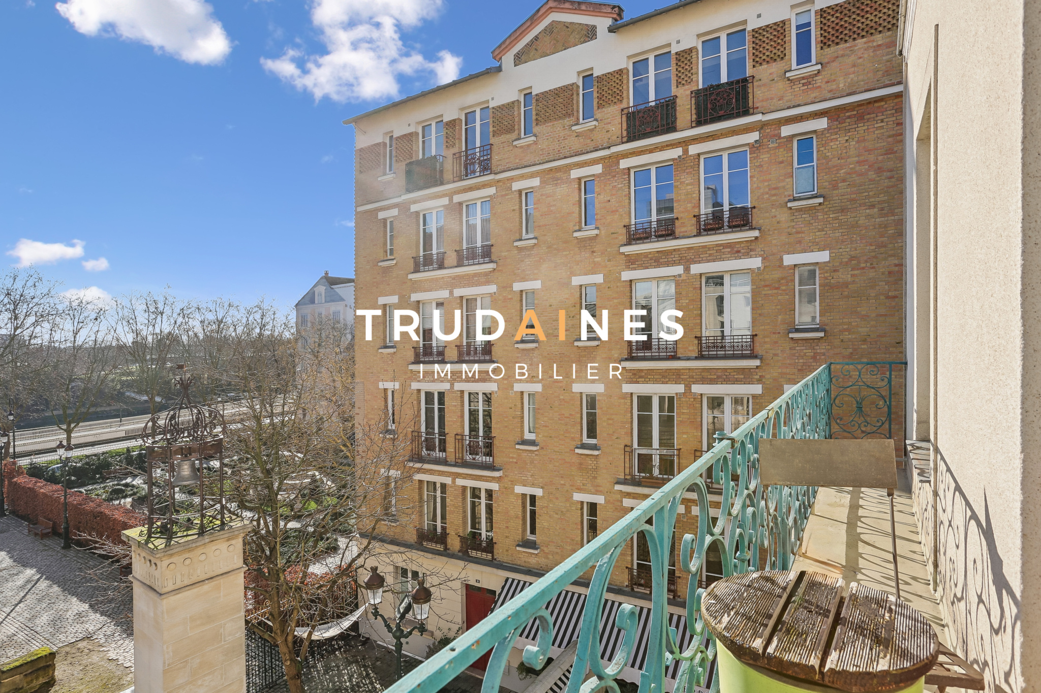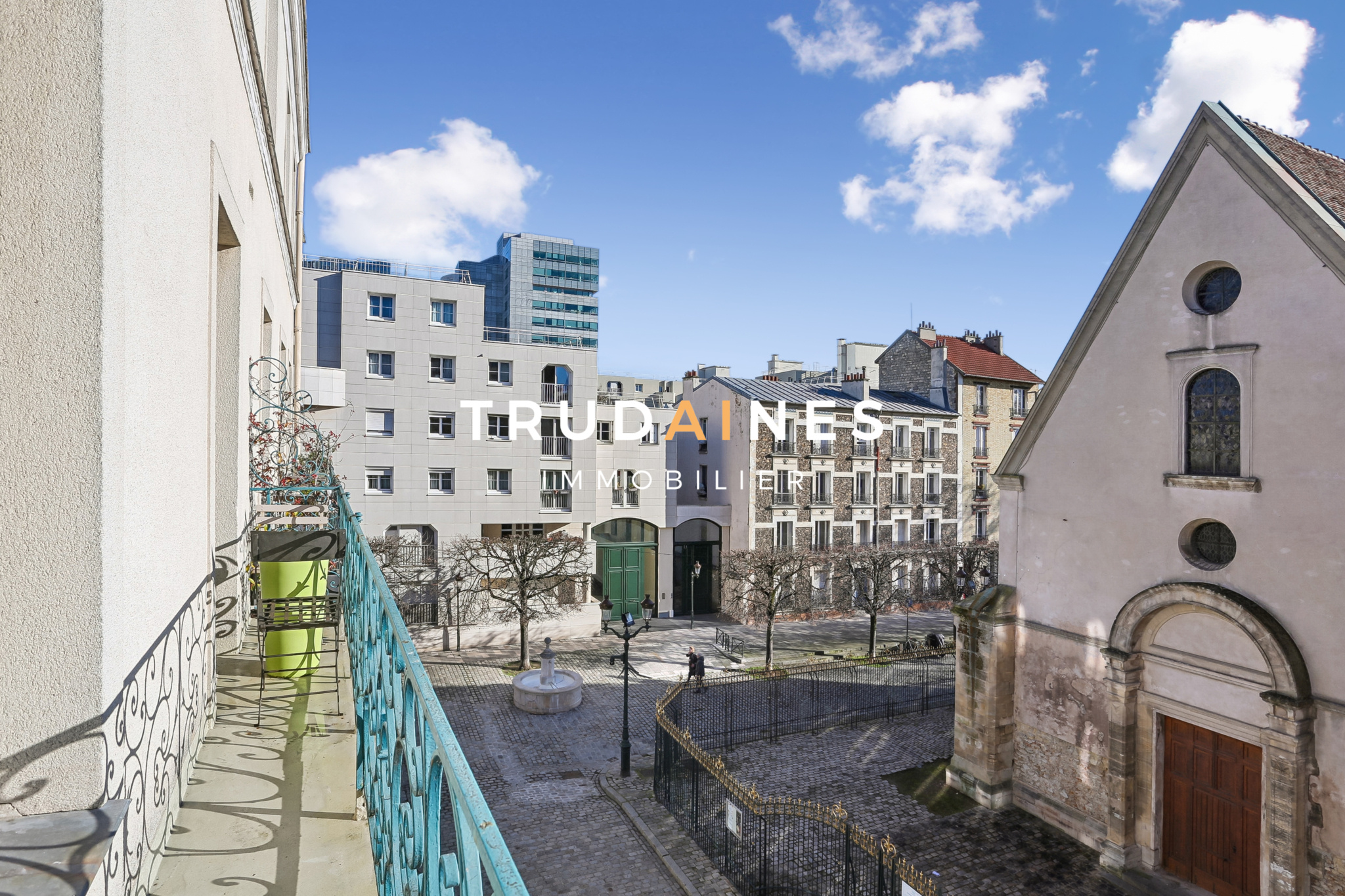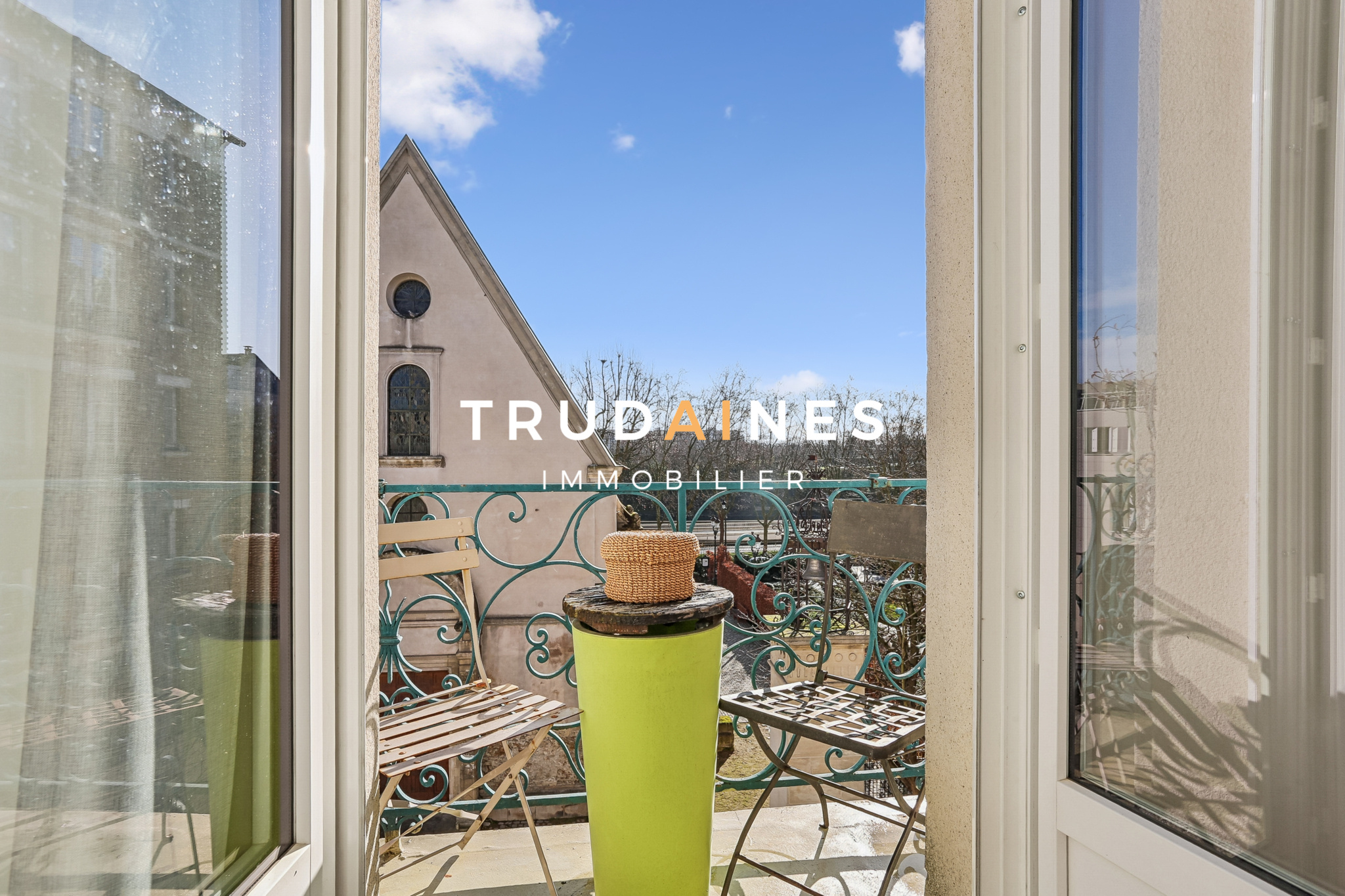 Un balcon filant permet d’installer une table, 2 chaises, et des plantes, avec vue dégagée sur l’église et la Seine.