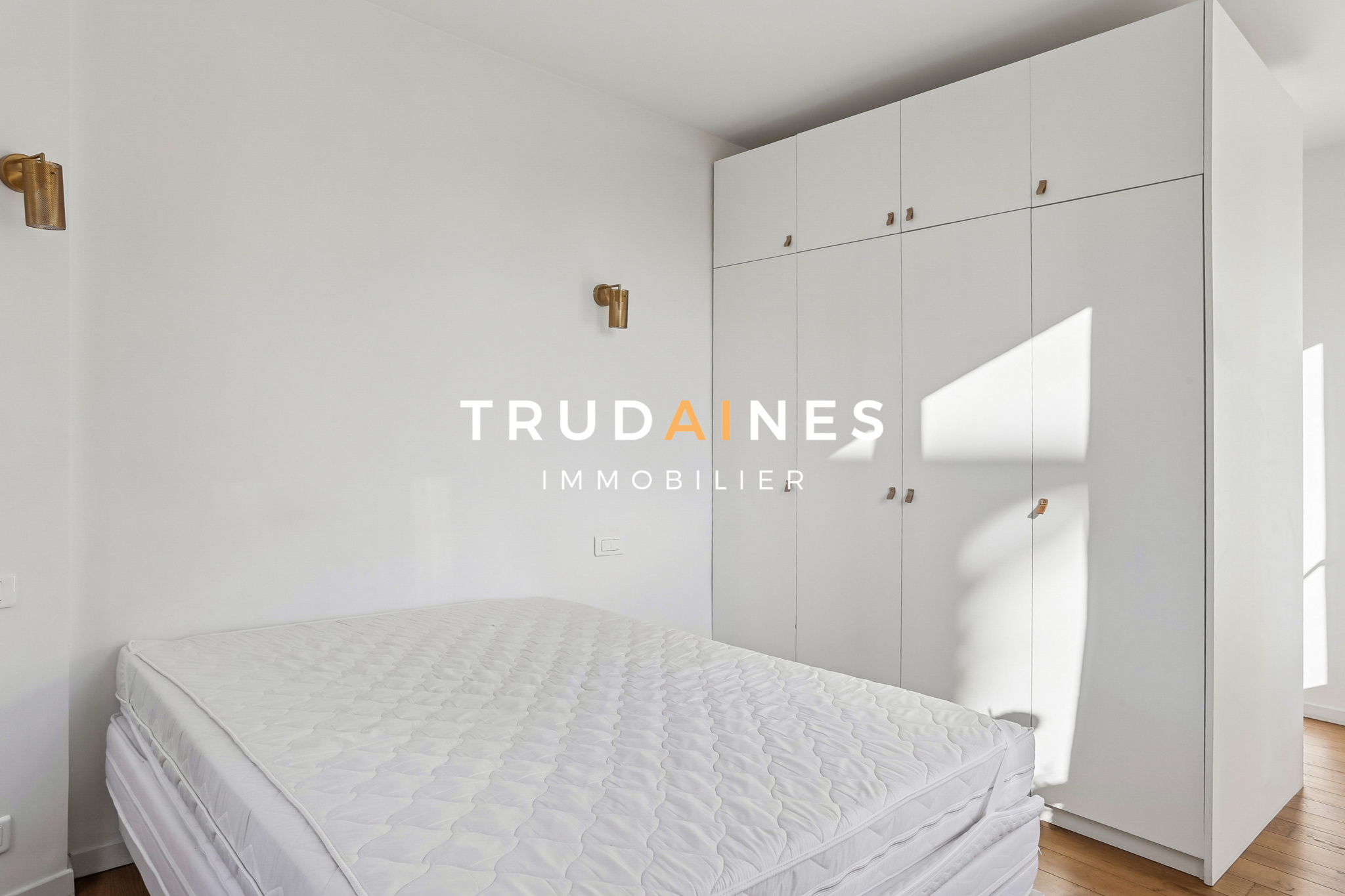 Côté nuit : une grande chambre d’angle avec rangements et coin bureau aménagé sur mesure.