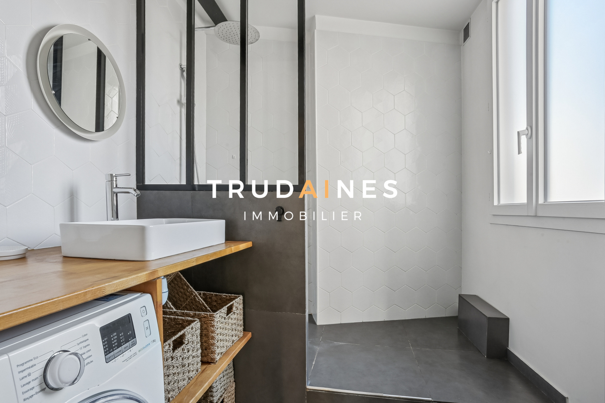 Salle d’eau rénovée avec paroi type atelier, vasque sur plateau de bois carrelage blanc à relief alvéolaire, sèche serviette et fenêtre.